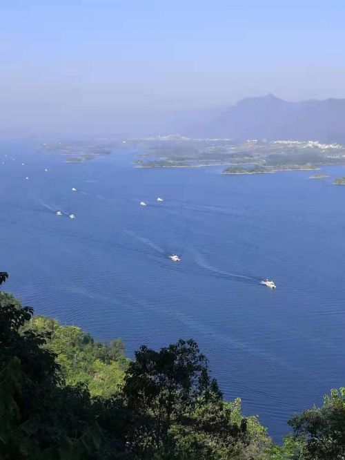 一早,我們集合完畢之后便驅車來到了天空之城,放眼遠眺,美麗的仙島湖就像一張湛藍的地毯,一個個小島就像鑲嵌在地毯上的綠寶石,只見湛藍的湖面上漂浮著許許多多個小島,它們形態各異,有的宛如一位靚麗的少女,跪伏在水面上祈求蒼天降福人間;有的似千年老龜,安詳地匍匐在湖中。