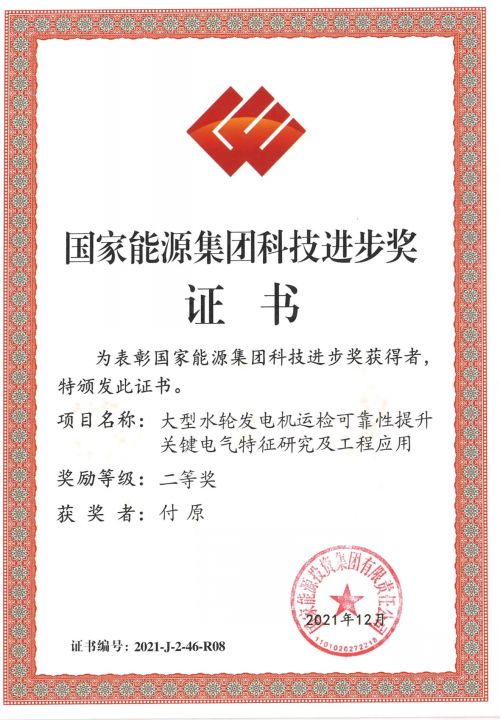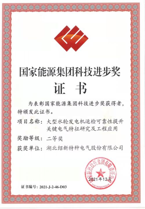 對湖北紹新特種電氣股份有限公司及付原、傅祺兩名同志,在《大型水輪發電機運檢可靠性提升關鍵電氣特性研究及工程應用》項目完成中,所發揮的重要作用、取得的突出成績給予獎勵,并頒發國家能源集團科技進步二等獎證書。